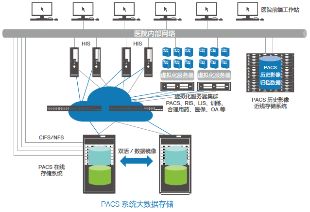 高速调用影像:采用 SAN+NAS 存储作为核心存储,存储 PACS 系统数据库和在线的 PACS影像文件,给予高速的数据访问能力;